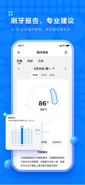 刷牙报告与数据分析服务:日、周、月维度的刷牙报告实时同步更新,结合专业建议助力用户优化刷牙习惯,全面提升口腔健康水平。