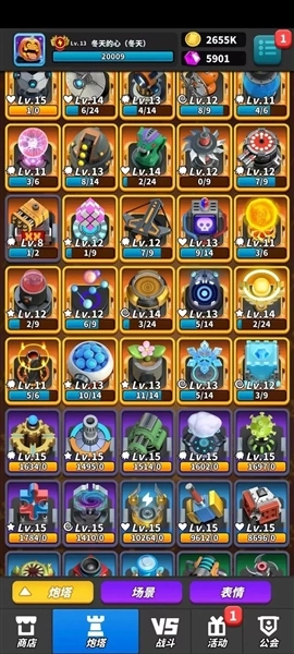 进入【炮塔界面】后,玩家能够在此处进行阵容搭配,熟悉自己拥有的英雄,对塔进行升级操作,同时还可以管理场景与表情。