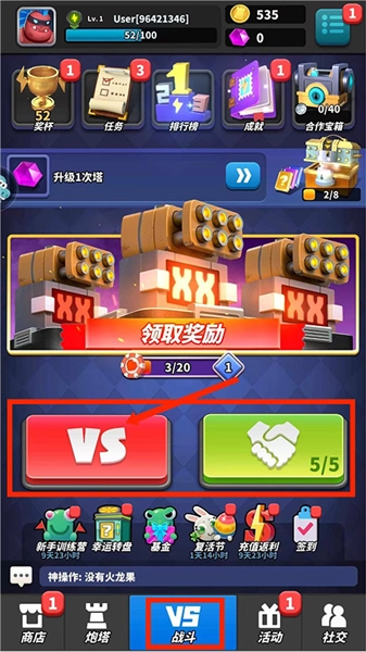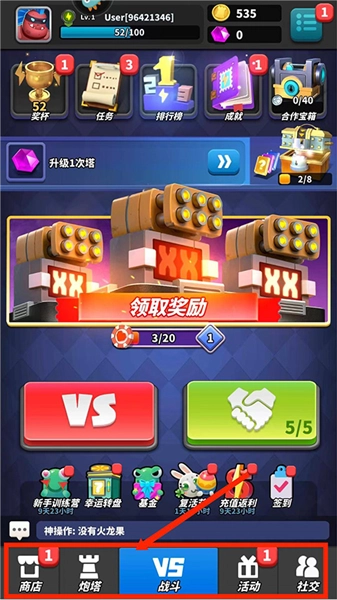 打开僵尸风暴游戏并进入主界面后,你会看到界面分为【商店】、【炮塔】、【战斗】、【活动】和【社交】这几个栏目。