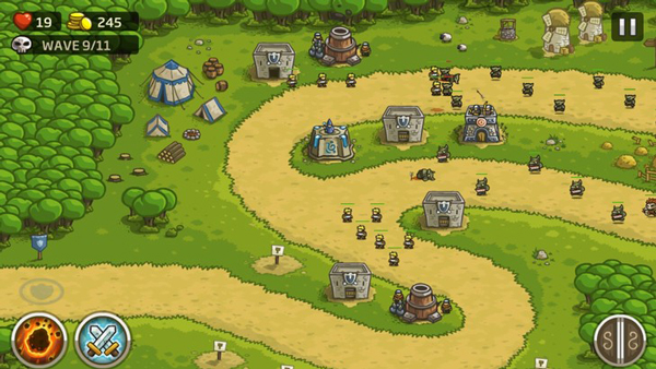 一款即时战略性的游戏。游戏的玩法和平常我们所见到的塔防游戏非常类似,但真正玩起来这个游戏更感觉是在打一场战争。为什么这么说呢?因为皇家守卫军采用的主要是军事元素,比如建造的塔有兵营,弓箭塔,炮塔甚至还有法师塔。我们的任务很简单明了,就是守住防线,防止被突破到家园内。