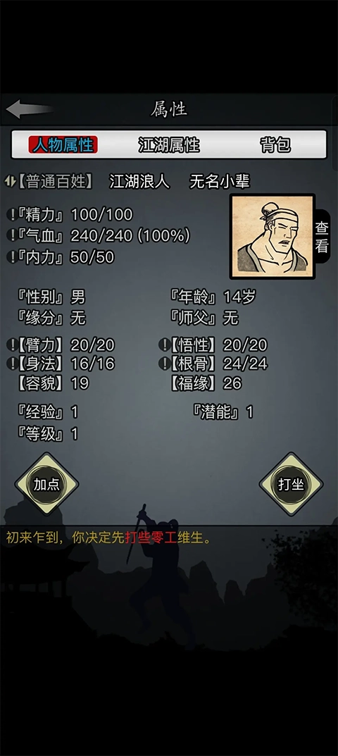 进入新区丹阳朝凤后,开局有四种选择,我们只要选孤儿开局就行。选孤儿开局能额外加5点福缘(福缘能提高挂机和日常任务的收益,不过提升福缘的唯一途径是买月卡,孤儿开局就等于多了2.5张月卡的效果)