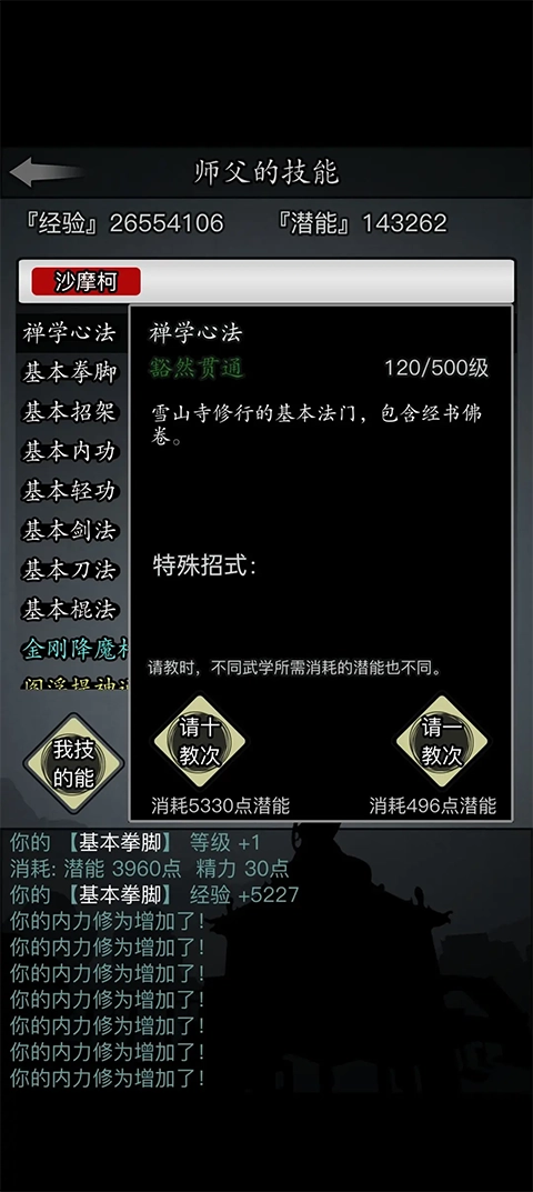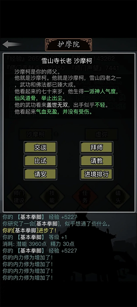 点击师傅后,通过请安可获得500贡献点,若拥有月卡还能额外获取2000贡献点;点击请教则可以学习技能。