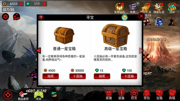 这款游戏的关卡系统包含20个章节,每个章节下设10个小关卡,每关会根据玩家剩余血量评定星级;界面下方的宝箱属于星章奖励,分别对应累计获得15星、25星和30星的解锁条件,宝箱内的奖励颇为丰厚。 游戏内设有英雄商店,所有英雄均可在此购买;灵魂石可用于英雄升星,但升星操作存在一定的成功率机制。此外,游戏内副本玩法丰富多样,每次挑战副本都能获取大量奖励。我个人最喜爱的是矿洞玩法——玩家可派遣英雄协助挖矿,英雄战斗力越高,挖矿收益加成越显著;通常4天内即可挖掘800颗以上钻石,收益速度极快,借助这些钻石便能兑换更多英雄。