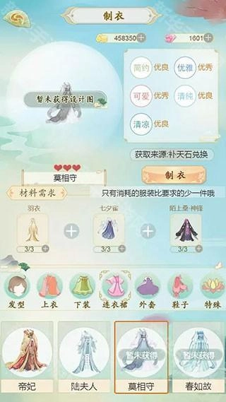 定制服装所需的材料涵盖特定成衣、服装原料与染料。其中,服装原料可借助分解重构模块,对多余服饰进行分解来获取;染料则仅能通过补天石兑换。利用设计图制作服装时,所需的均为指定成衣,不过必须拥有图纸方可定制,图纸既可以直接购买,也能通过补天石兑换,因此游戏里的万界比美活动务必参与,否则将没有足够的补天石用于兑换。 制衣过程中消耗的原材料均为相对低级的服装,当所需材料满足时,点击制作,制作出新服装后,材料服装仍会保留一件。对于定制服装,同样需要材料齐全,若材料缺失,可通过钻石、金币购买,还有部分材料需要完成任务才能获取。