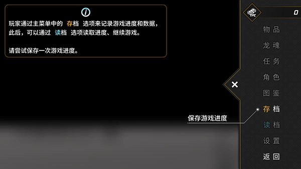 接着点击右侧的存档选项就能保存游戏进度,之后可以借助读档选项调取进度、继续游玩。