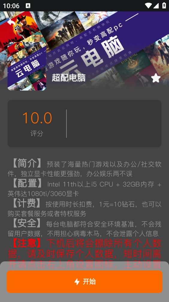 在云电脑详情页,点击"开始"按钮。