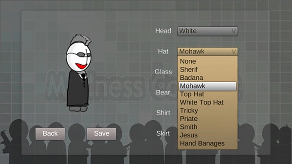 在界面右侧挑选head(头部)、hat(帽子)、glass(眼镜)、shirt(上衣)这类外观选项,就能对角色的发型、眼镜样式、肤色和服装风格进行自定义设置,全部调整好后点击Save按钮保存这些配置即可。
