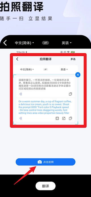 在使用图像翻译功能时,点击拍摄按钮获取带有文字的图片,系统会自动识别图片中的文字并给出翻译结果。