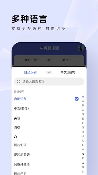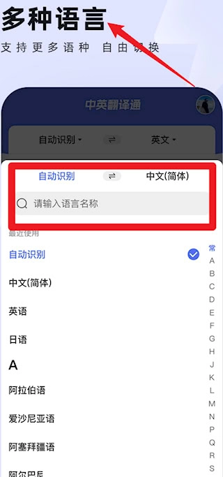 语言选择页面具备语种自动检测功能,用户也能通过手动快速搜索或直接切换的方式来选定所需的源语言和目标语言。
