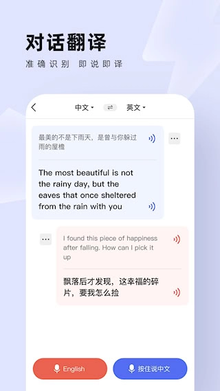 对话翻译功能支持双方轮流发言,您可根据实际需求点击对应语种的语音按钮,系统将实时完成互译并呈现文字内容。