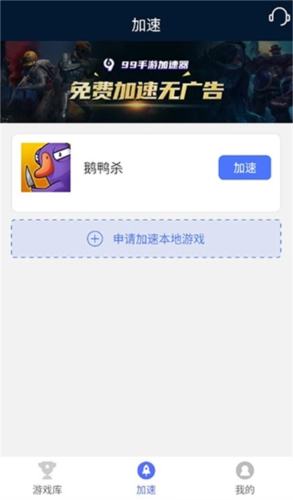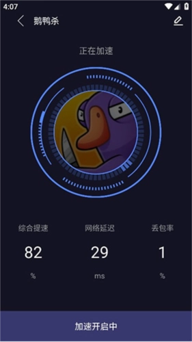在本站下载的软件安装完成后,需先通过实名认证方可使用;进入软件后,就能看到手机里已安装的游戏。我们以近期热门的“鹅鸭杀”为例,点击对应的加速按钮即可开始加速。