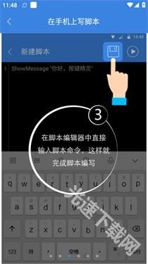 在编辑器里直接输入脚本命令,就能完成脚本的编写,之后点击上方的“保存”按钮就可以了。