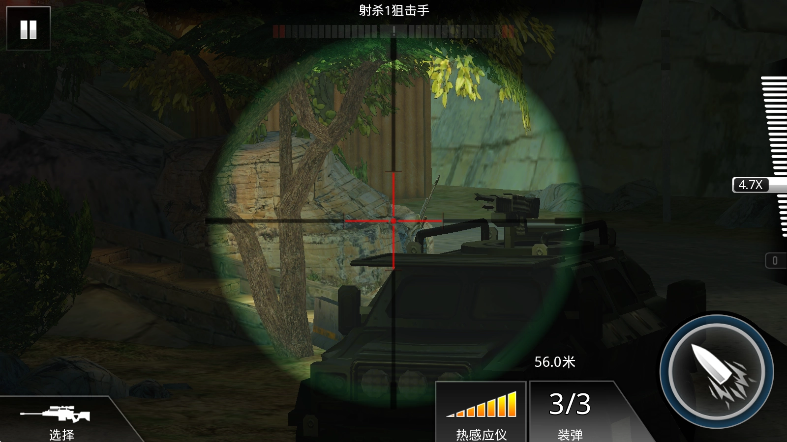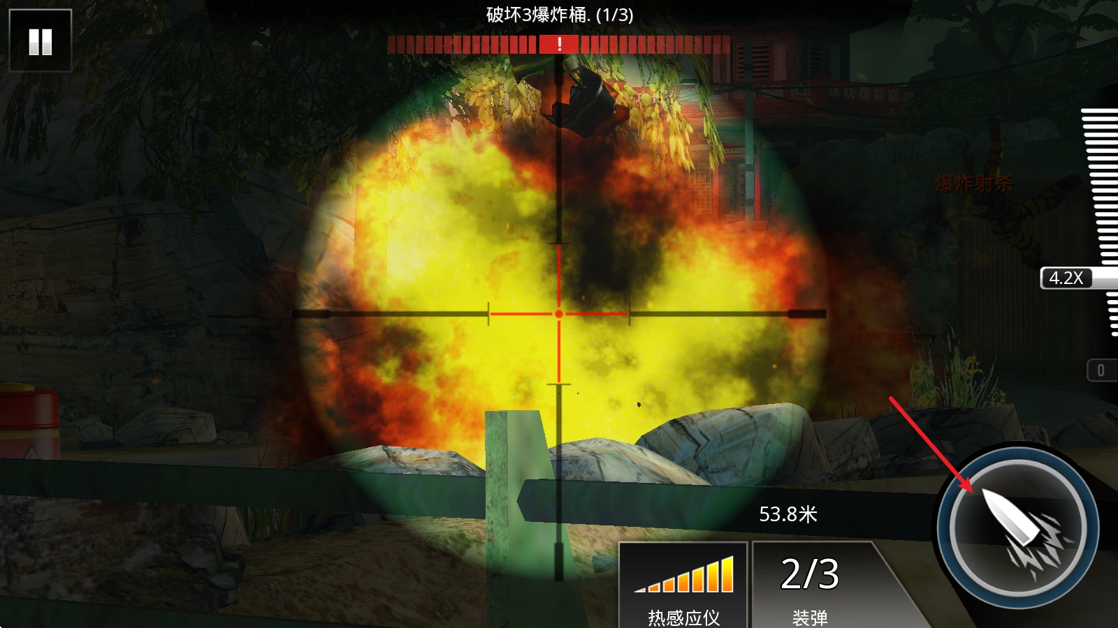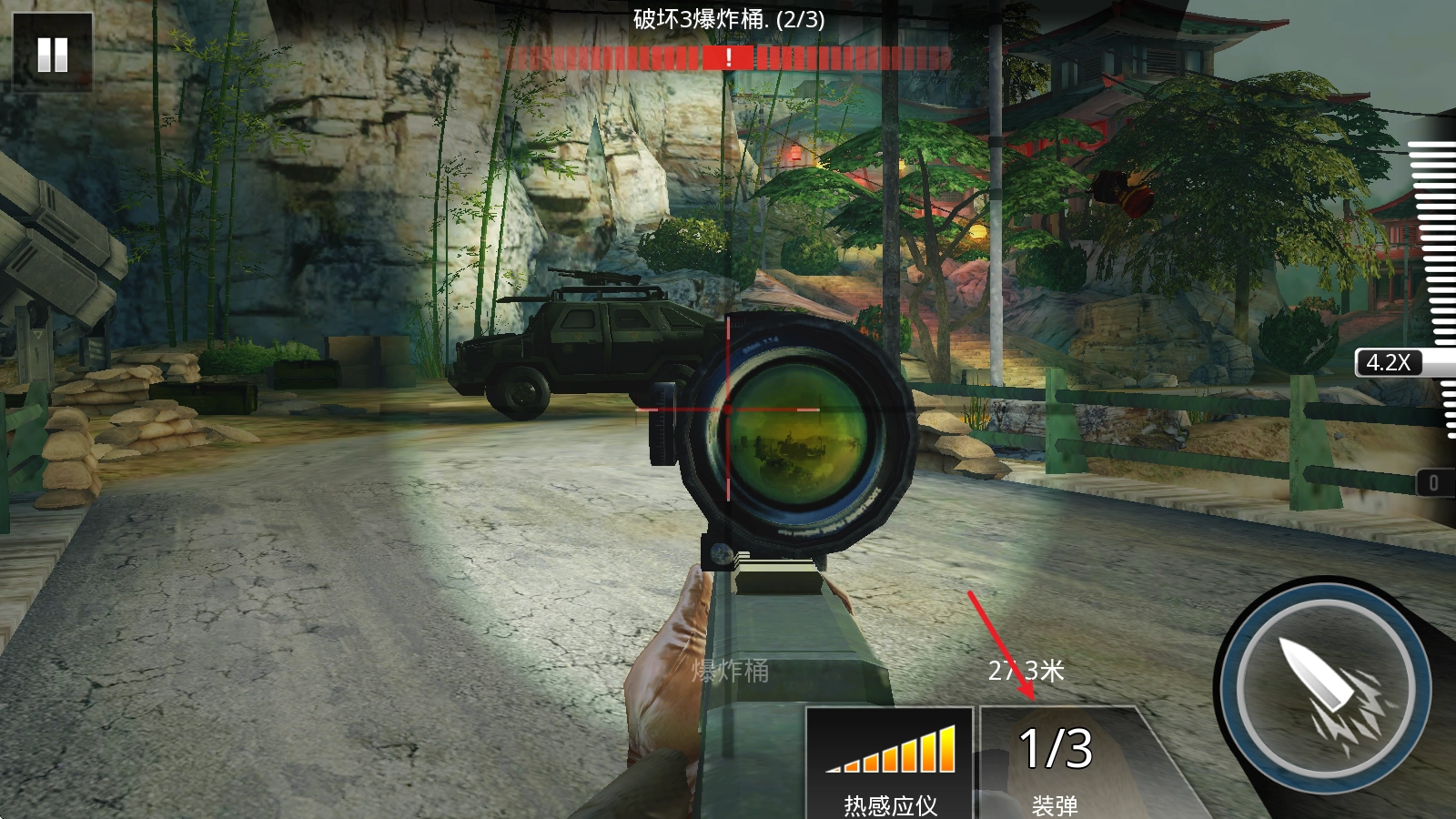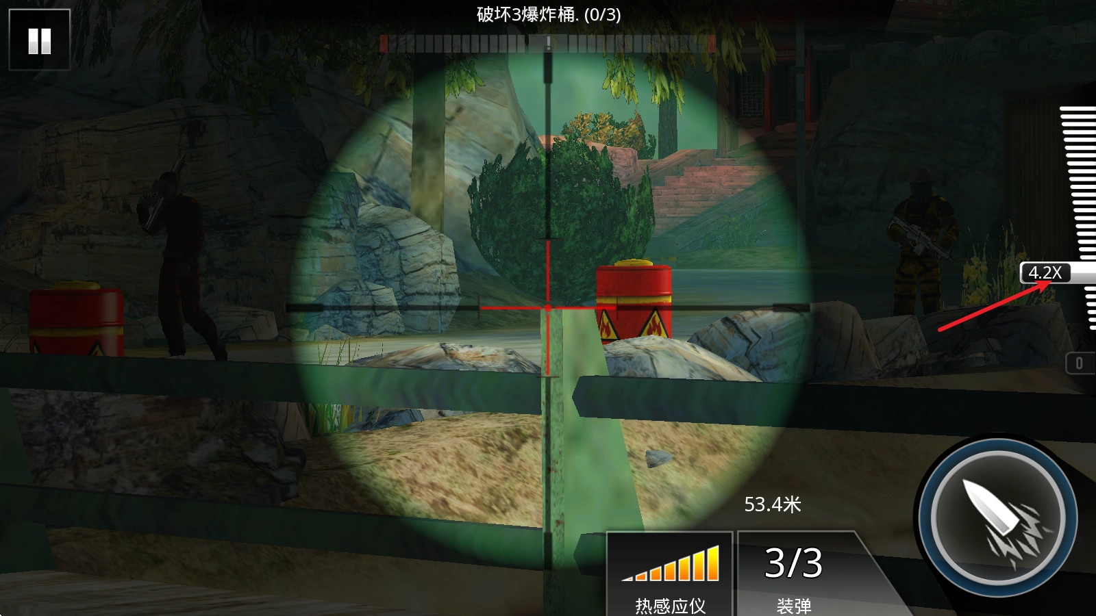 进入场景后,拖动右侧的进度条,我们就能开启狙击镜进行瞄准了。