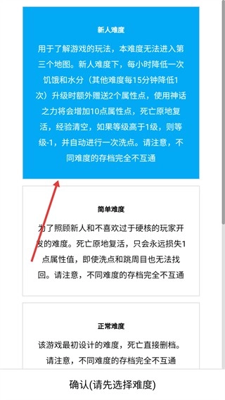 新手可以选择【新人难度】,这个难度下每小时会降低饥饿度和水分值,升级时会赠送2个属性点,死亡后会在原地复活,但经验会被清空。