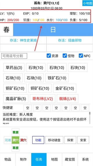前往【孤岛洞穴】采集【草药丛3份】与【石块10块】,请留意保持【饥饿值100】和【水分值100】的状态,同时注意不要让负重超过100。