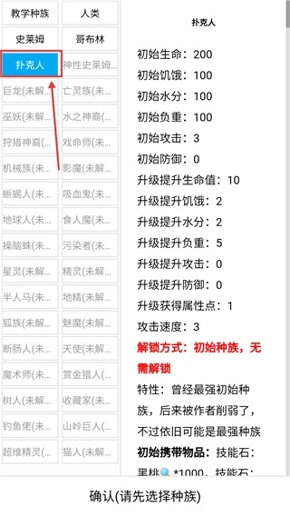 选择初始种族为【扑克人】,其初始状态为生命200、攻击3;每次升级时,生命提升10点,饥饿值增加2点;该种族的特性是“曾为最强种族”。