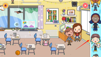2、滑动右侧人物栏,选择角色,拖入教室,安排到不同位置。