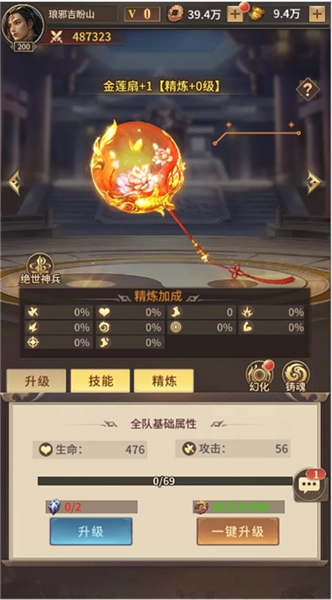 可使用精炼石提升神兵等级,提升神兵属性加成。