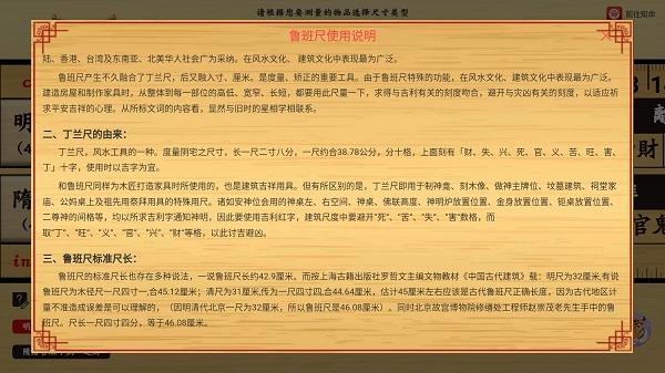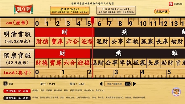 在中华鲁班尺里,你能精准测量各类桌椅的长度,还能便捷查看尺上的字义以判断吉凶,只需依据不同的测量数据,就能获取对应的字义。