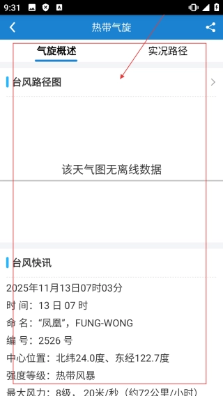 进入热带气旋界面后,能够查看气旋概述与实况路径,了解台风路径图和台风快讯,从而获取热带气旋的相关信息。
