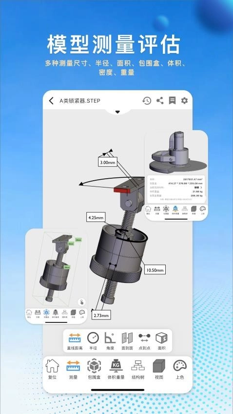 在原有的距离、半径、角度、包围盒、面积、体积、重量、报价等测量功能基础上,新增了点-点距、点-面距、点-线距、线-线距、线-面距、轴距、圆心距、点-圆心距、点-轴距、线-线角、线-面角等测量功能。