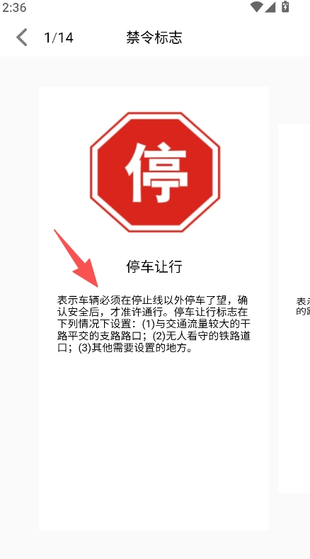 点击具体的交通标志(比如停车让行标志),就能查看该标志的含义以及它的设置场景。