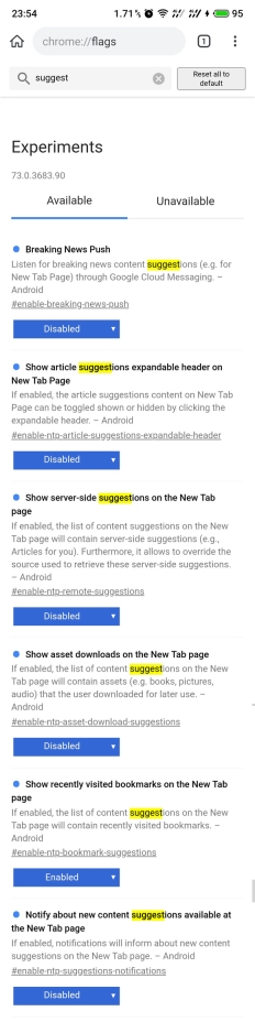 1、进入chrome://flags,搜索suggest,把有ntp描述的设置为disabled即可: