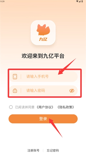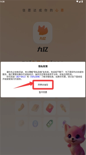 打开九亿应用,在弹出的隐私政策提示框中勾选同意并接受的选项。