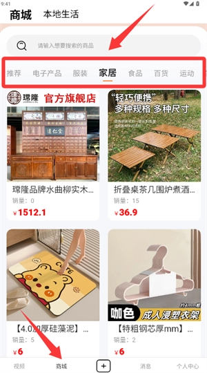 成功登录系统后,进入商城区域,在顶部的分类栏中选择家居类等商品类别。