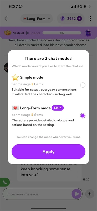 不同的聊天模式,花费的宝石数量不同,故事模式需要10宝石,而休闲模式只需要2宝石,用户可以根据自己的宝石数量选择