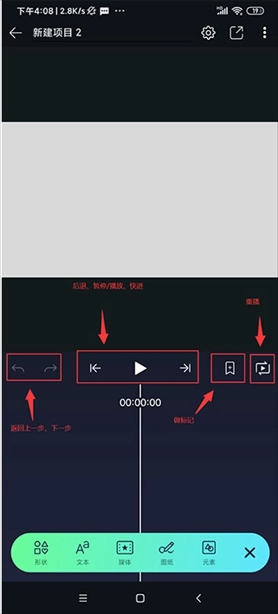 5、可以添加形状、文本、媒体(手机上的图片和音乐还有视频)、图纸、元素;