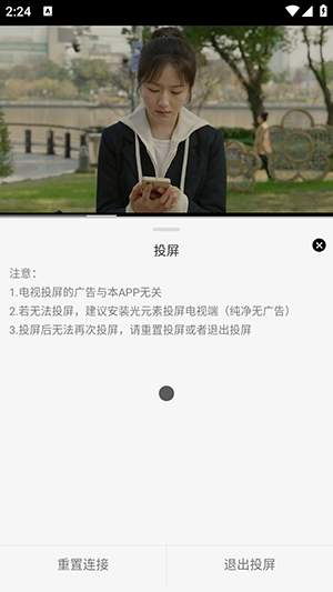 点击播放页面右上角的TV图标,就能搜索并连接投屏设备。