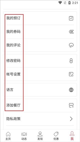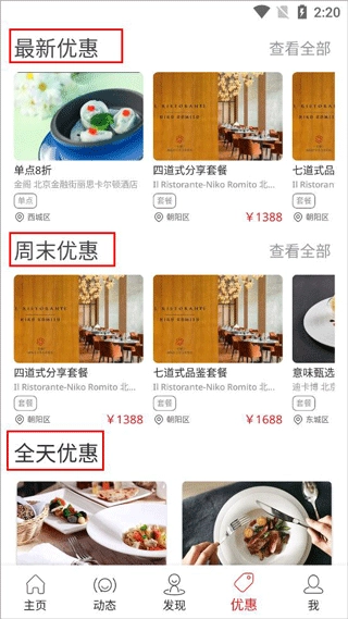 1、打开鼎食聚,包含主页、动态、发现、优惠和我的版块,首页主要是一些餐厅优惠券合集,可以在线订餐;