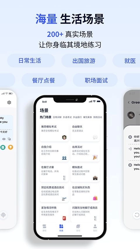 1、支持英语口语场景自由练习,灵活选择适配场景开展训练;