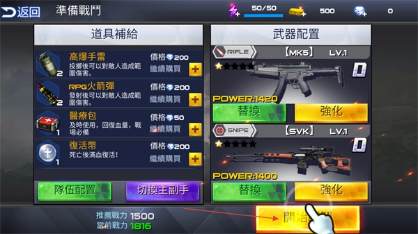 在战斗准备界面,你可以选择购买道具补给,也可以选择强化武器。等所有准备工作都完成后,点击界面下方的“开始战斗”按键,就能进入战斗环节了。