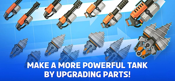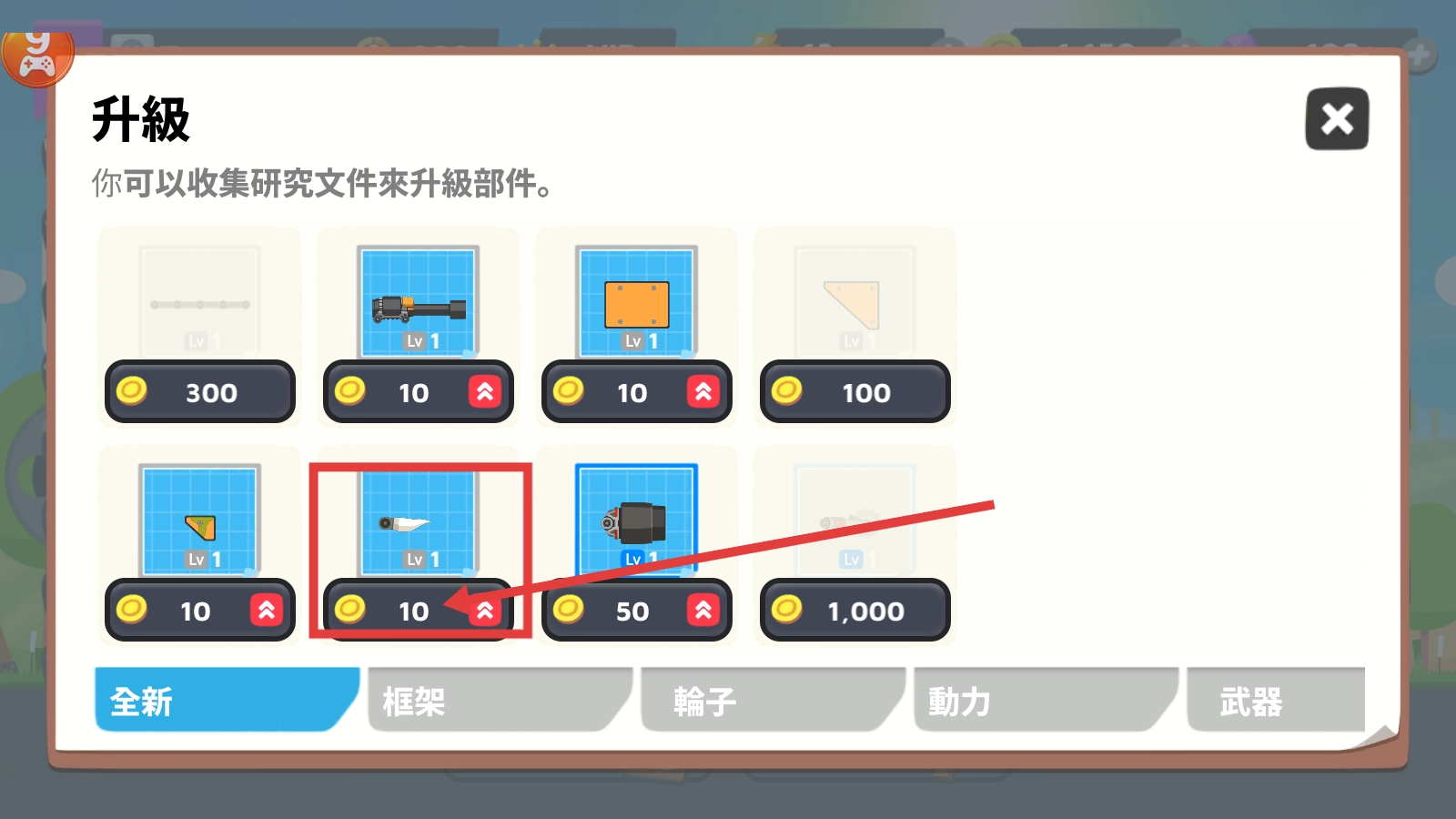 在升级界面花费10金币提升【尖刺-Lv1】这类部件,通过收集研究文件来增强坦克的战斗能力。
