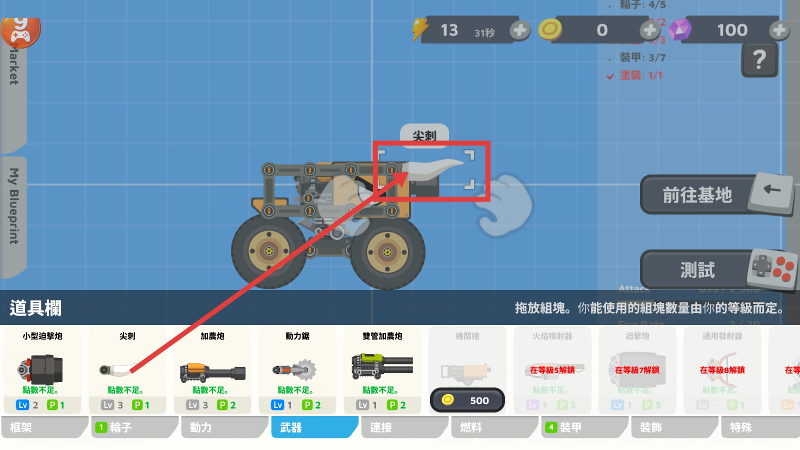 在组装界面中,把【尖刺】拖放到坦克上,与武器部件进行搭配组合,以此提升坦克的攻击能力。
