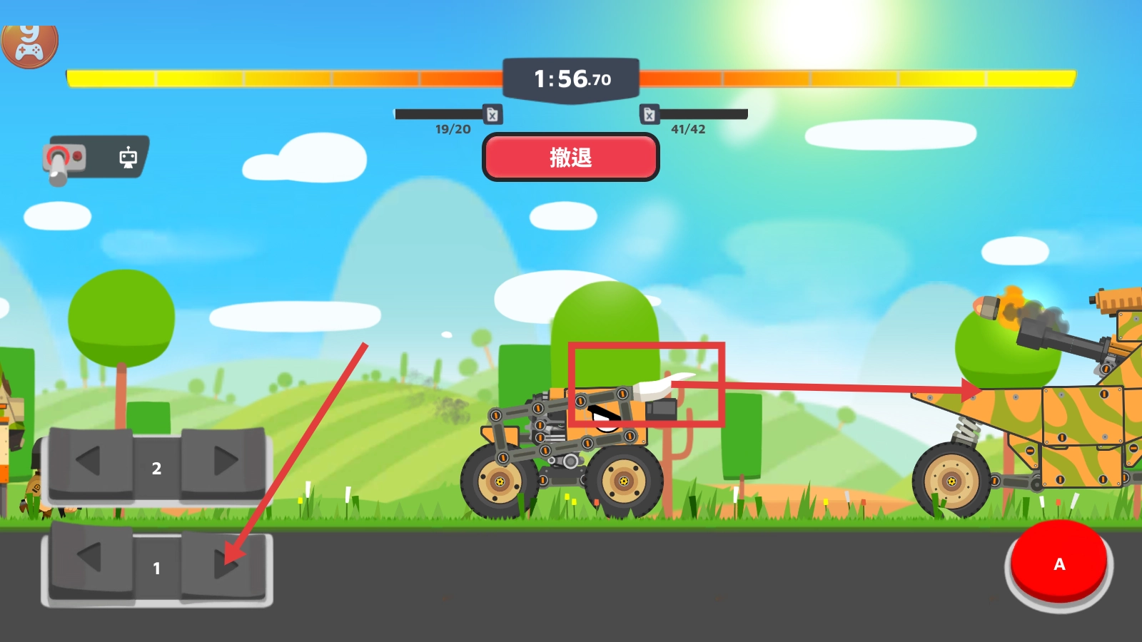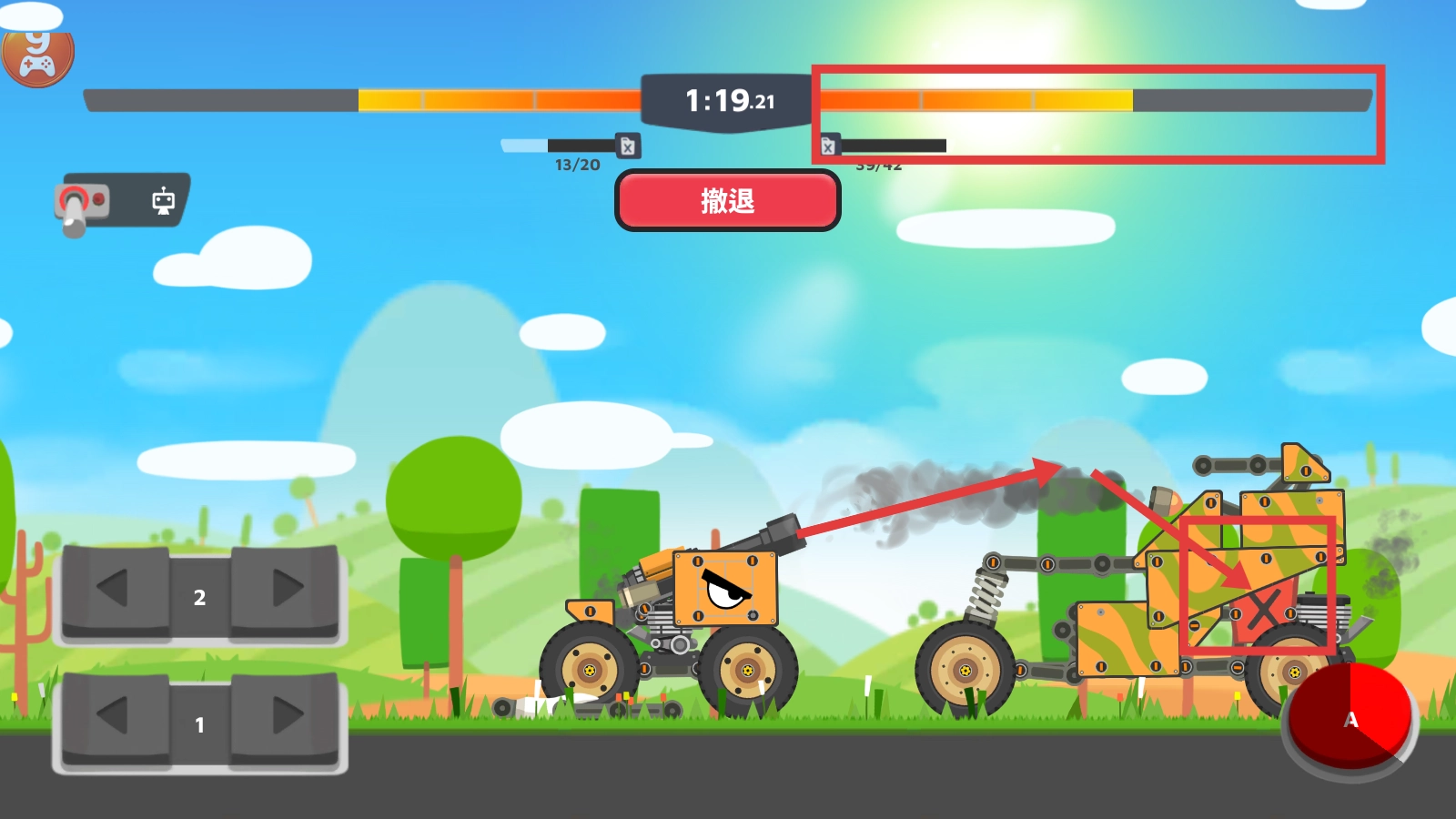 战斗时,通过1号方向键操控坦克移动,点击红色的【A】按钮,借助【尖刺】对敌方坦克发起攻击。