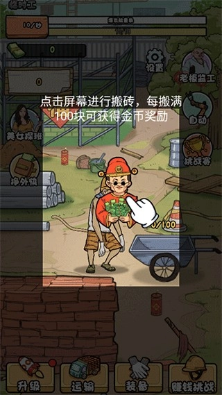1、进入游戏后,点击屏幕即可开始搬砖,每当搬砖数量累积到100块时,就能领取金币奖励