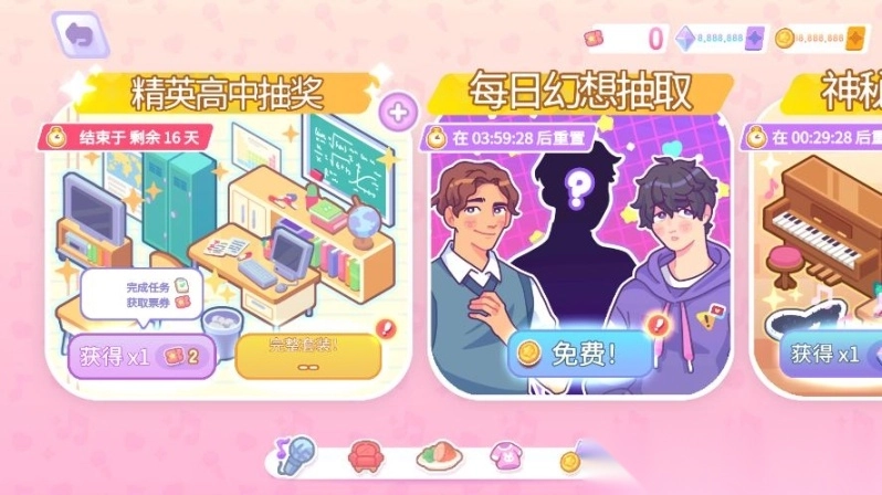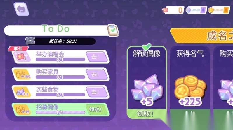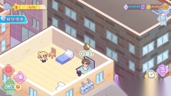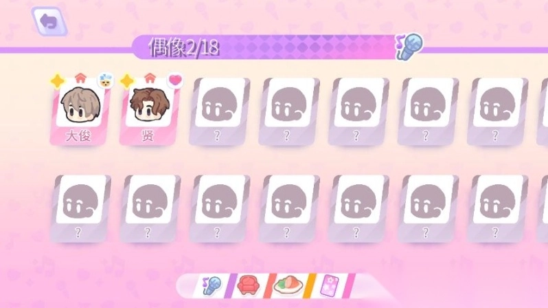持续完成各项任务,逐步解锁更多偶像;对这些偶像进行训练后,继续完成任务,进而解锁更多房间用于装扮。