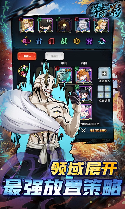 在猎影游戏里,你可以招募各类不同的特级咒术师加入己方阵营,组建特别行动队,开启对咒术世界的一系列征战之旅,探索各异的秘境,重温动漫里的全部剧情内容。