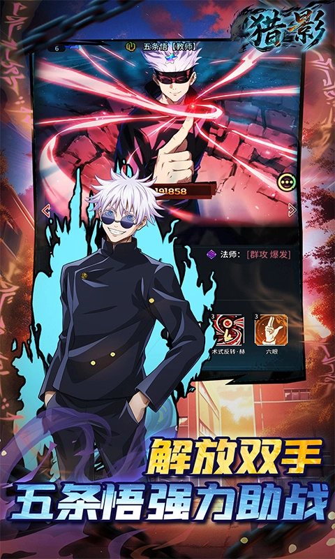 猎影游戏是一款改编自日本动漫的RPG角色扮演游戏,在游戏里你能体验到多部动漫中的经典角色,无论是五条悟、虎杖悠仁、伏黑惠还是钉崎野蔷薇等知名角色都会在游戏中登场。你需要在游戏里维持自己的咒术战斗能力,而且还有众多知名声优全程配音,能为你带来最真实、最完善的游戏体验,努力成为最厉害的咒术师吧。
