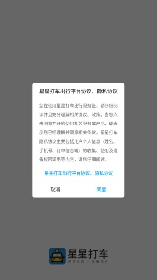 星星打车正版,1、安装软件后,新用户需同意软件协议及隐私政策。