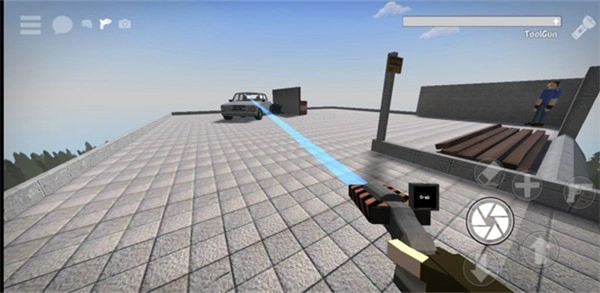 2、左边移动右边射击,点击左上角进行切换武器,使用手中的这把武器对着物体点击,会出现蓝色的引线,将它们连接起来,你可以通过滑动屏幕来移动这些物品的位置了。