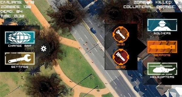 打开游戏界面右上角的设置按钮,在参数设置里能够分别对平民和僵尸进行各项配置,包括平民的数量、平民武装的百分比,以及僵尸的数量、移动速度、出现位置等一系列参数。