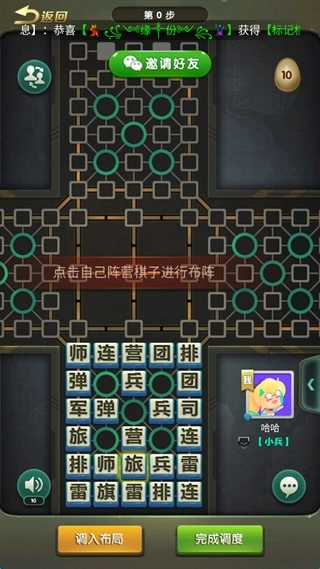 你可以这样调整棋子位置:点击自己的棋子进行移动,调整好后点击屏幕下方的“完成调度”按钮;要是想和朋友对战,点击屏幕上方的“邀请好友”就能直接分享给微信好友,开启对局啦。