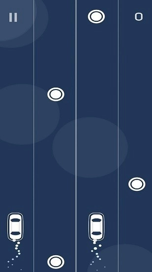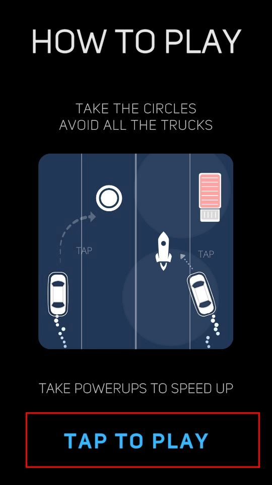 点击界面底部的“TAP TO PLAY”按钮即可进入游戏,游戏中操控汽车在车道间移动的方式是点击屏幕切换位置,核心目标是收集白色圆圈道具,同时必须避让粉色卡车,一旦汽车与卡车发生碰撞。