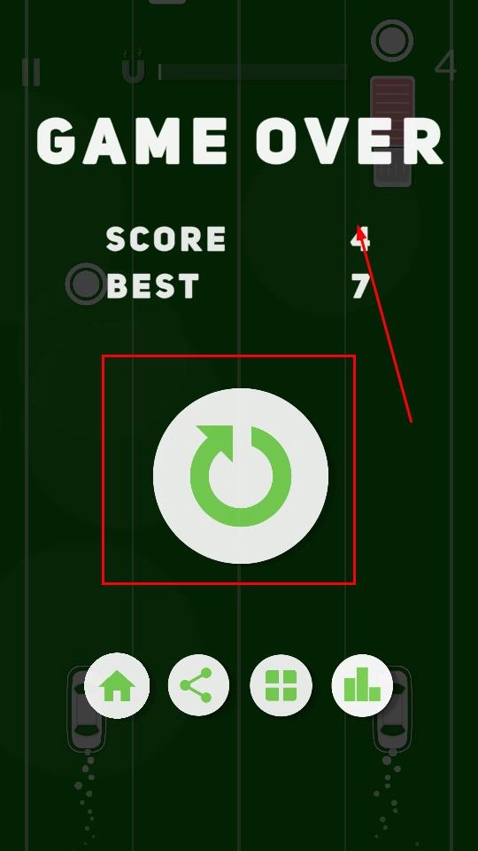 如果游戏因碰撞而结束,界面会展示当前得分和历史最高分,这时点击中间的绿色循环箭头图标,就能重新开启挑战,争取刷新更高分数。