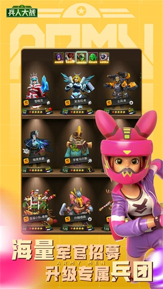 支持坦克、火炮、狙击手等兵种进行升级,解锁规模庞大的玩具兵科技树,借助研发科技、推进军官兵种进阶的方式,不断壮大军团实力,增强战场竞争力。