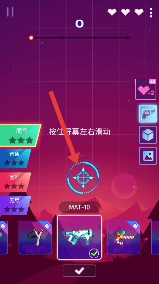 在射击闯关游戏里,你可以按住屏幕左右滑动来调整瞄准方向,选好简单难度和MAT-10武器后,就能开启游戏啦。